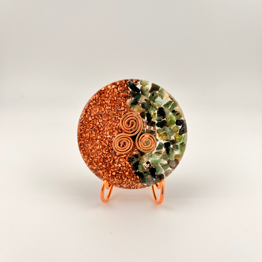 Each piece is carefully crafted using resin, pure recycled copper, a hand-shaped copper spiral, and a triskelion we create ourselves.