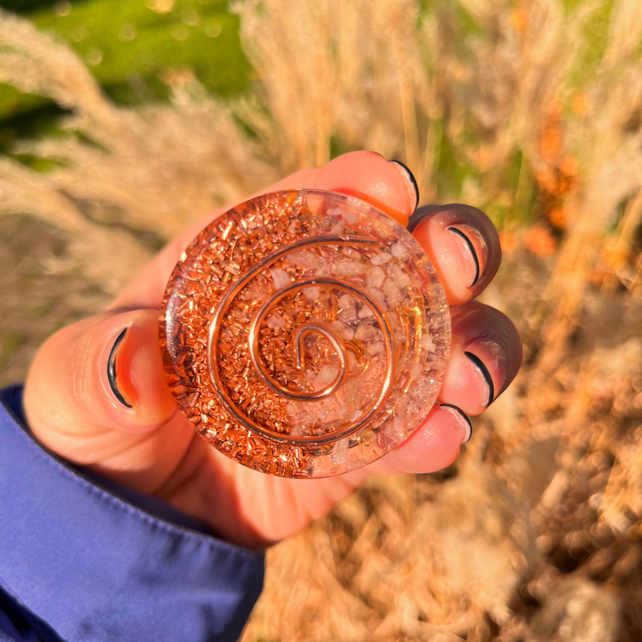 Each piece is made from resin and 100% pure copper, recycled and processed by us. The spiral, triskelion (shaped by hand), and the two wire rings — all made of copper — work together with clear quartz to enhance its amplifying and harmonizing effect.